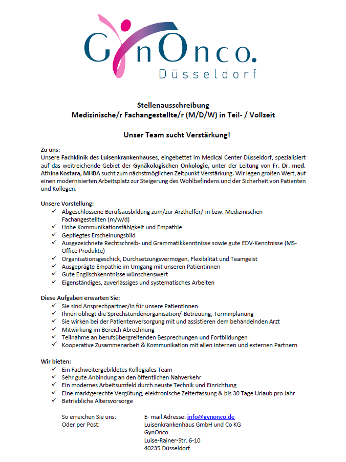 Medizinische Fachangestellte MFA (m/w/d) Unser Zentrum ist spezialisiert auf das weitreichende Gebiet der Gynäkologischen Onkologie. Wir legen großen Wert, auf einen modernisierten Arbeitsplatz zur Steigerung des Wohlbefindens und der Sicherheit von Patienten und Mitarbeitern. Wir suchen ab [...]